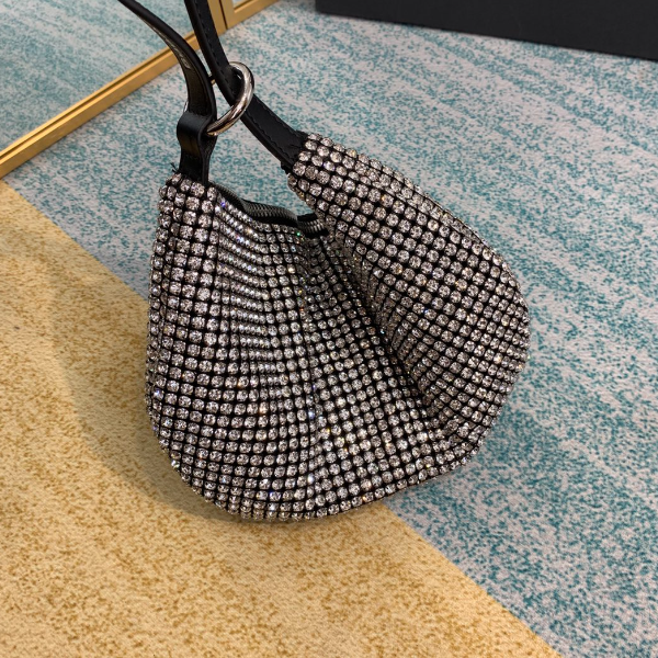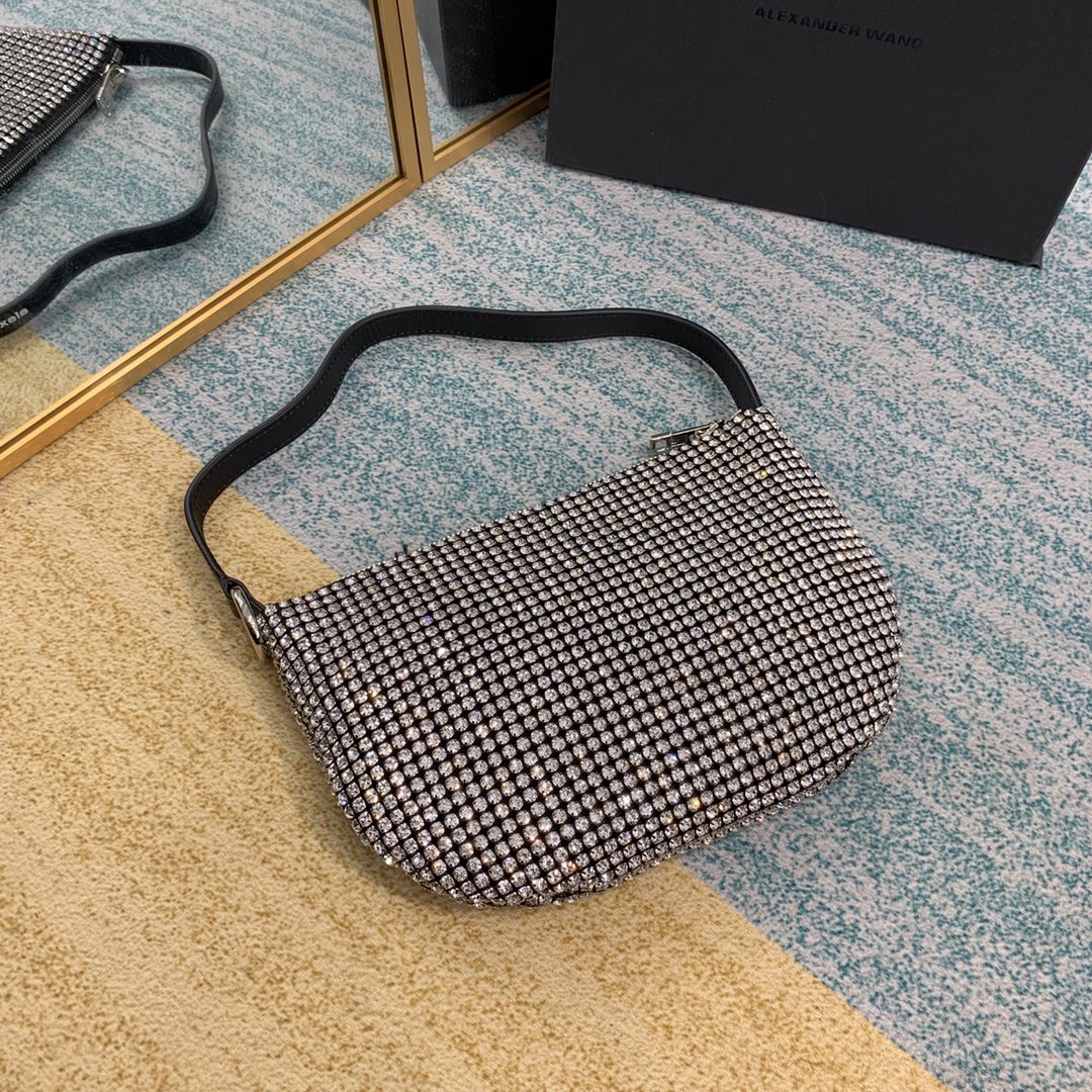 Alexanderwang white rhinestone chain mesh clutch can be carried on the shoulder or folded into a fortune cookie clutch. Debossed brand logo printed shoulder strap Internal logo patch Top zip closure Model 1060