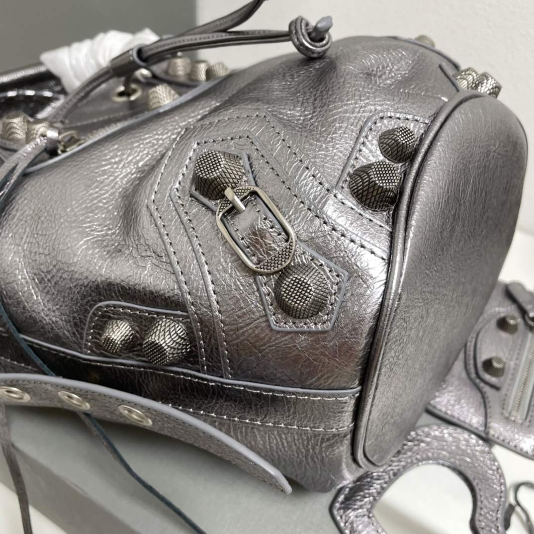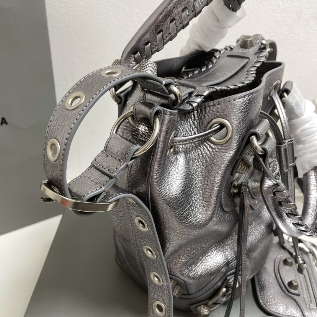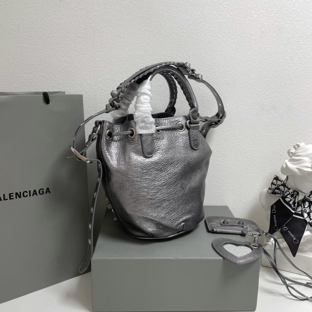 Balenciaga 𝐁𝐚𝐥𝐞𝐧𝐜𝐢𝐚𝐠𝐚’s popular “Le Cagole” series is a modern interpretation of its “City” handbags – reshaped into a bucket bag design to inject a new soul into it. The large size adds two round top handles, combining classic and Modern trends are perfectly integrated. On the basis of retaining the original DNA of the motorcycle bag’s flat rivets, delicate buckles and tassel zippers, it adds adjustable woven shoulder straps and a cute and playful heart-shaped mirror, which perfectly softens the neutral temperament of the original version. .