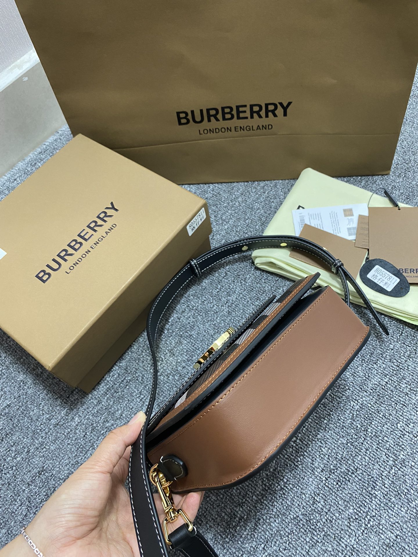 B’s latest crossbody bag, made of large checkered and topstitched leather materials, with a front panel design, highlighting the elegant arc. Finished with gold-plated logo eyelets and a glossy push-button in the shape of the brand’s logo. Paying homage to the brand’s history, the bag bears the names of founder Thomas Burberry’s mother, sister and eldest daughter. Carry it crossbody or over the shoulder using the detachable and adjustable strap.