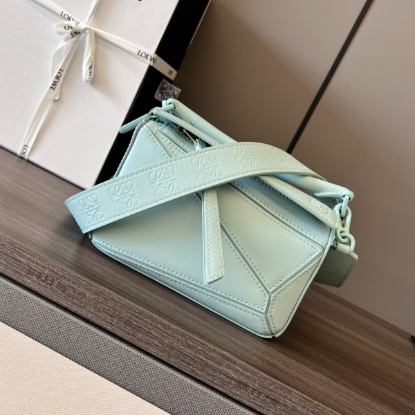 The cuboid shape and precise cutting techniques create Puzzle’s unique geometric lines 🌟This mini version is made from satin calf leather with tonal hardware and comes with a detachable shoulder strap embossed with LOEWE on one side and LOEWE on the other. Decorated with Anagram. Detachable shoulder strap for cross-body, shoulder, hand or top handle carry Detachable shoulder strap Zip closure, cowhide zip puller Exterior back pocket, one internal slip pocket Can be customized with shoulder strap and personalized charm Tonal herringbone cotton canvas Lining Anagram embossed 🌟Tonal hardware