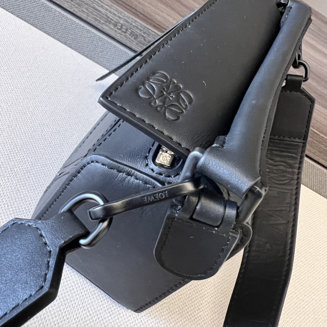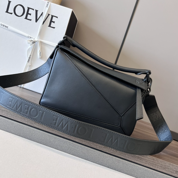 The cuboid shape and precise cutting techniques create Puzzle’s unique geometric lines 🌟This smaller version is made from satin calf leather with tonal hardware and features a detachable shoulder strap embossed with LOEWE on one side and LOEWE on the other. Anagram on the side. Detachable shoulder strap for cross-body, shoulder, hand or top handle carry Detachable shoulder strap Zip closure, cowhide zip puller Exterior back pocket, one internal slip pocket Can be customized with shoulder strap and personalized charm Tonal herringbone cotton canvas Lining Anagram embossed 🌟Tonal hardware