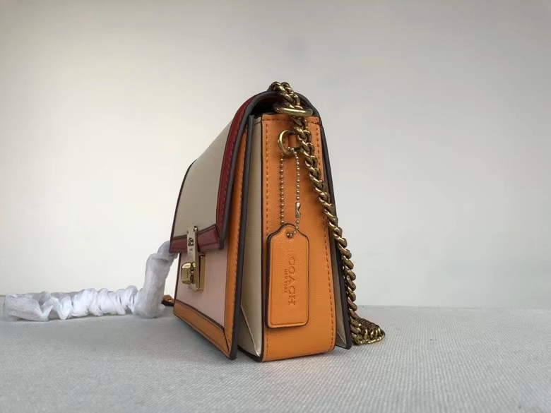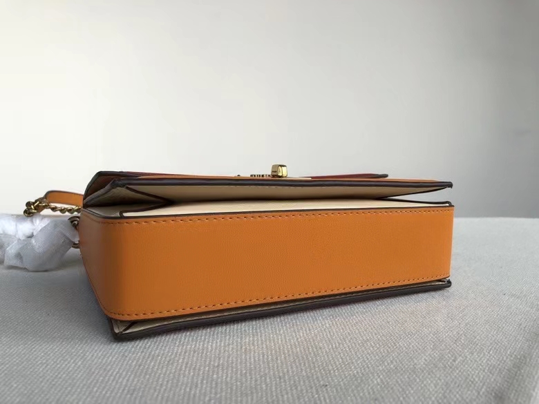 Hutton is made of refined calfskin, with twist-lock closure, retro hardware, fabric lining and a long sliding chain strap that can be worn on one shoulder and crossbody. This color scheme is amazing at first glance. It is lively and playful. The color scheme is special. Eye-catching