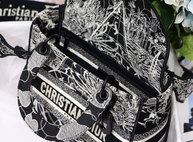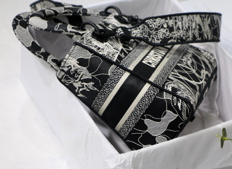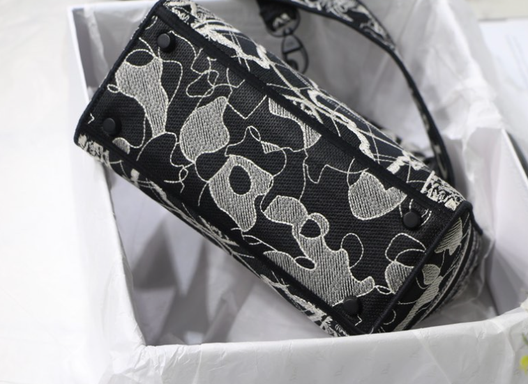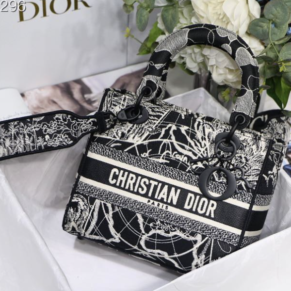 The Lady D-Lite bag combines classic elegance with the chic of the House of Dior. This black style is embroidered with the Dior Around the World motif in white throughout, accented with contrasting shimmering and matte embroidery threads. The front is decorated with the “CHRISTIAN DIOR” logo, and the “DIOR” charm is presented for the first time in shiny black metal, which is rich in texture and adds a touch of agility to the exquisite silhouette. Medium size, with a wide detachable double-sided embroidered shoulder strap, which can be carried by hand, over the shoulder or cross-body.
