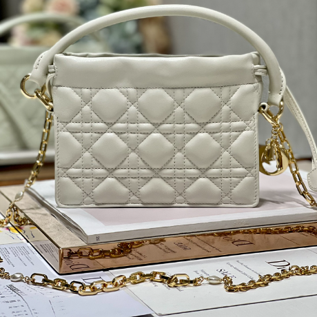 New this season is an elegant vintage-inspired mini bag with a top handle and drawstring that rounds out the Lady Dior collection. Crafted in white cannage lambskin, it features a DIOR charm and drawstring closure. With a detachable leather handle and detachable chain embellished with beads, it can be carried by hand or cross-body.