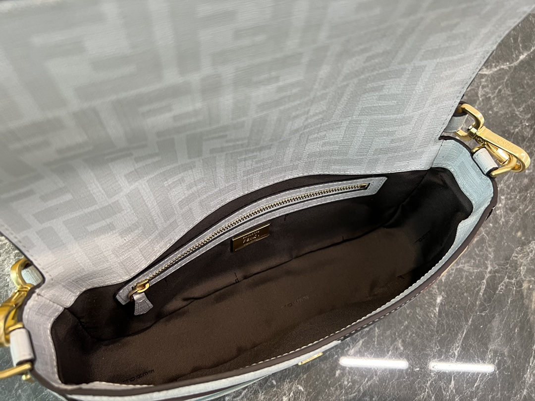 Signature Baguette medium bag in white fabric with tonal FF pattern, beige, brown and gold embossed and hand-applied leather. Decorated with FF buckle. The “Girl in Bikini” graphic is a tribute to the visionary acumen of fashion illustrator Antonio Lopez: evoking the warm and dynamic atmosphere of the disco era, while also interpreting the free and universal femininity that distinguishes the Fendi spirit. . Features front flap, magnetic closure, fabric-lined compartment with zip pocket, and antiqued gold-tone hardware. The bag features removable handles and shoulder strap, allowing it to be carried by hand, shoulder or cross-body.
