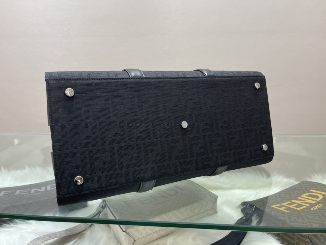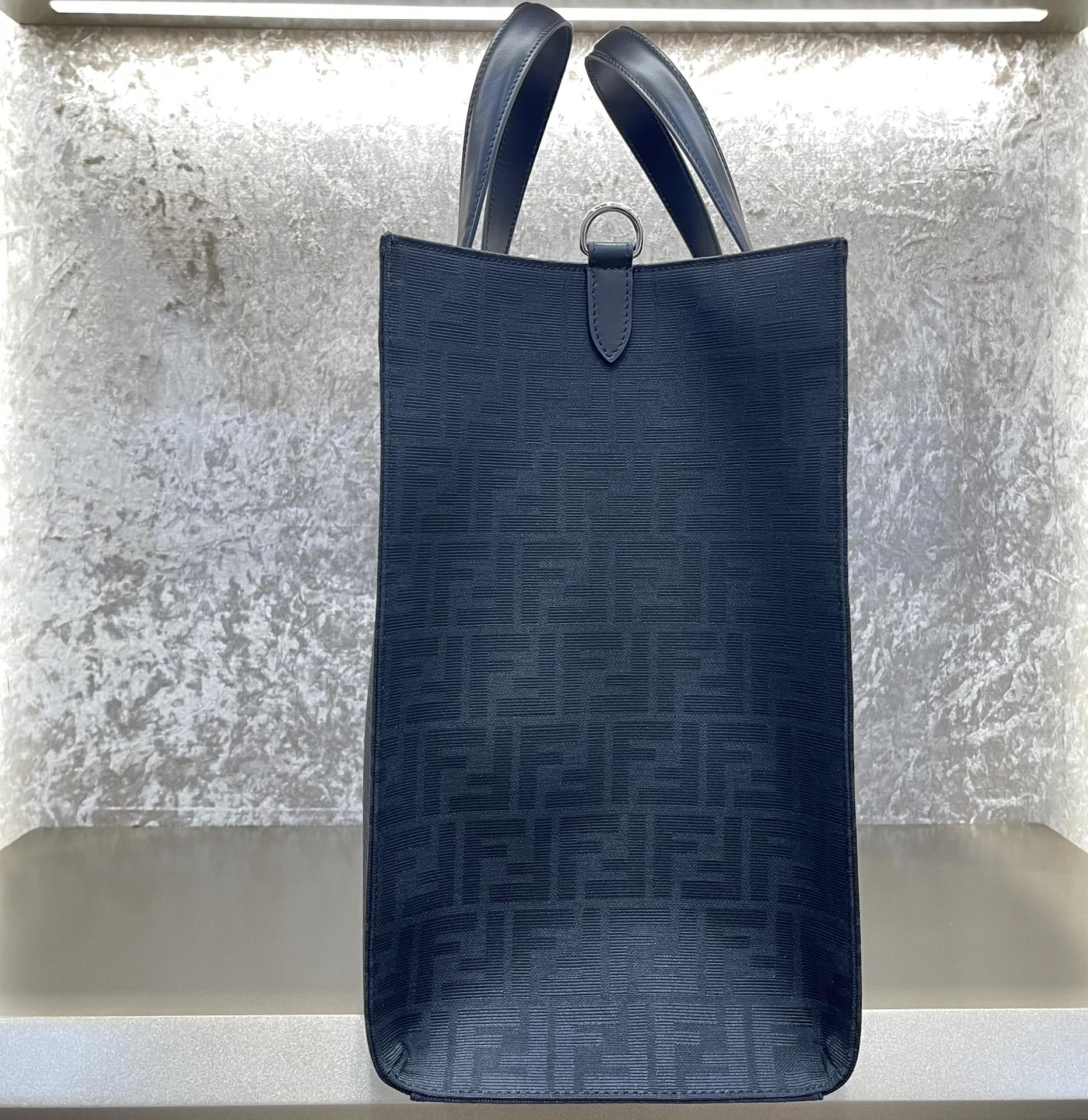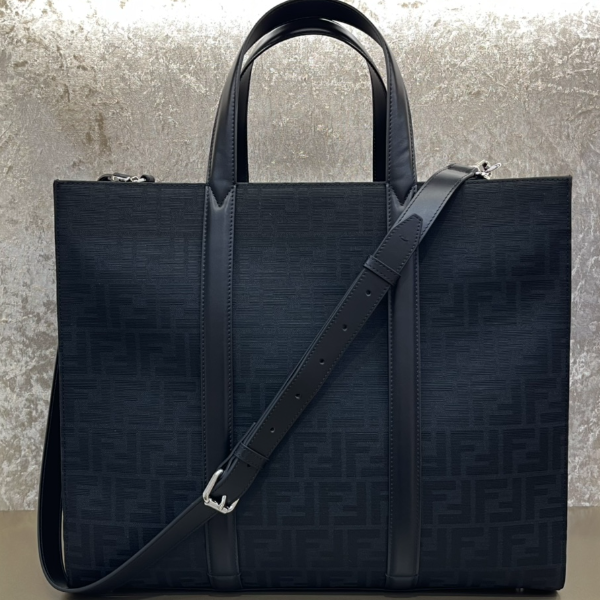 FEND1 large-capacity tote bag in recycled jacquard fabric with gray and black FF pattern. Featuring fabric-lined interior compartment, interior zip pocket, and silver-tone hardware. Featuring two leather handles and an adjustable and removable leather shoulder strap, it can be carried by hand or over the shoulder.
