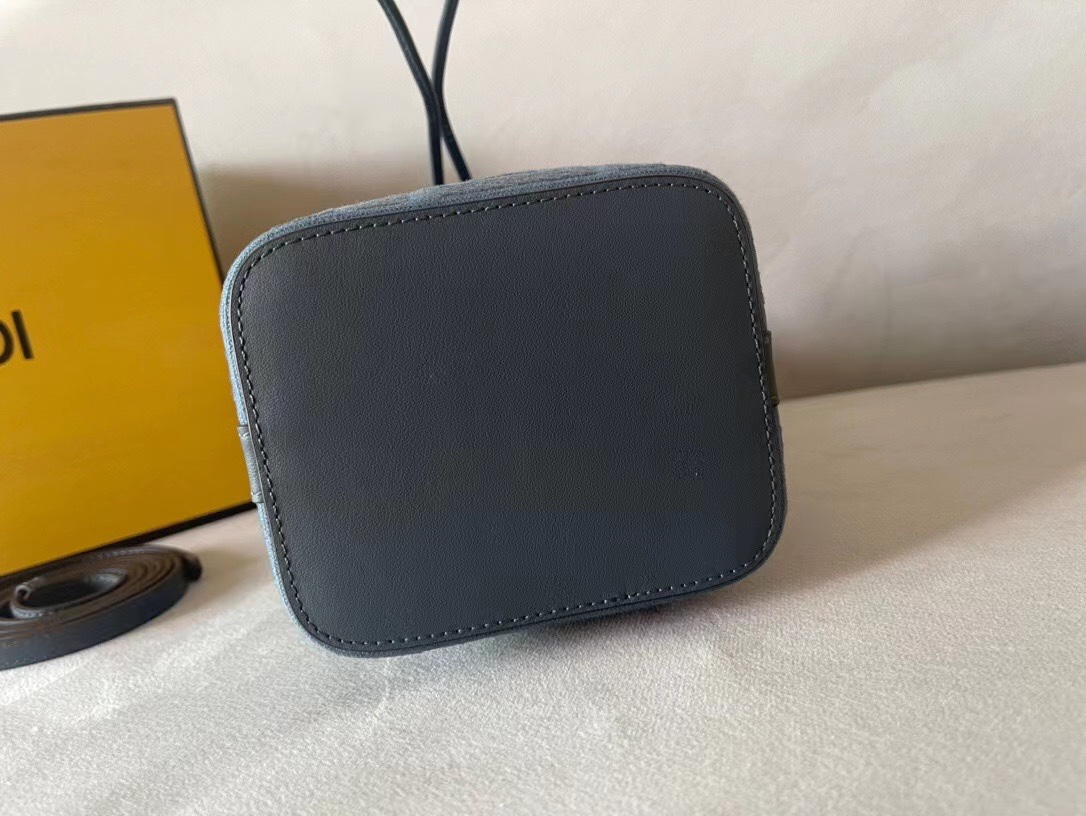 Mon Tresor small bucket bag, made of gray-blue canvas, decorated with tonal FF embossed pattern and embellished with tonal leather. Featuring lining and gold-finish hardware. Two detachable shoulder straps, one long and one short, made of woven soft nappa leather, can be worn on one shoulder or cross-body.