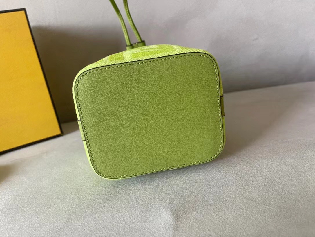 Mon Tresor small bucket bag, made of green canvas, decorated with tonal FF embossed pattern and embellished with tonal leather. Featuring lining and gold-finish hardware. Two detachable shoulder straps, one long and one short, made of woven soft nappa leather, can be worn on one shoulder or cross-body.