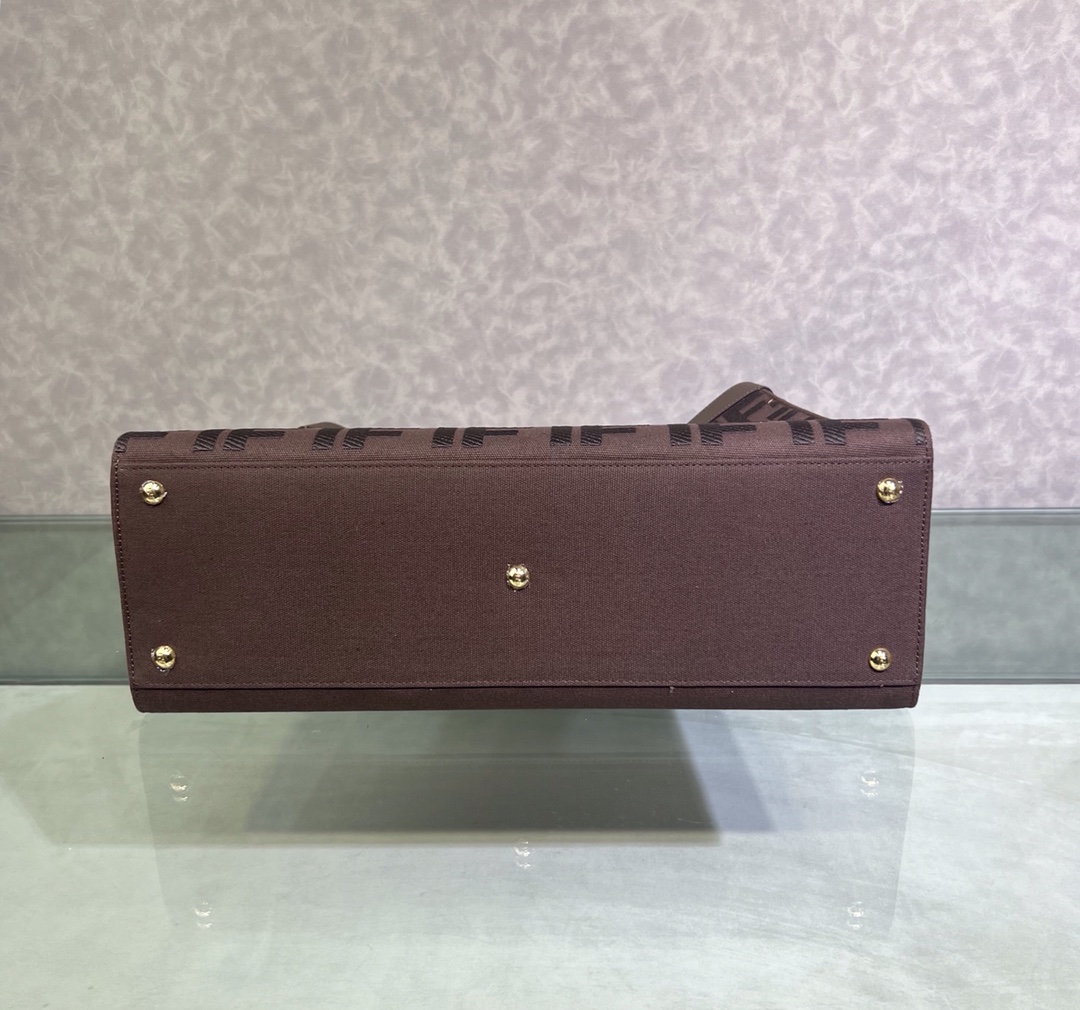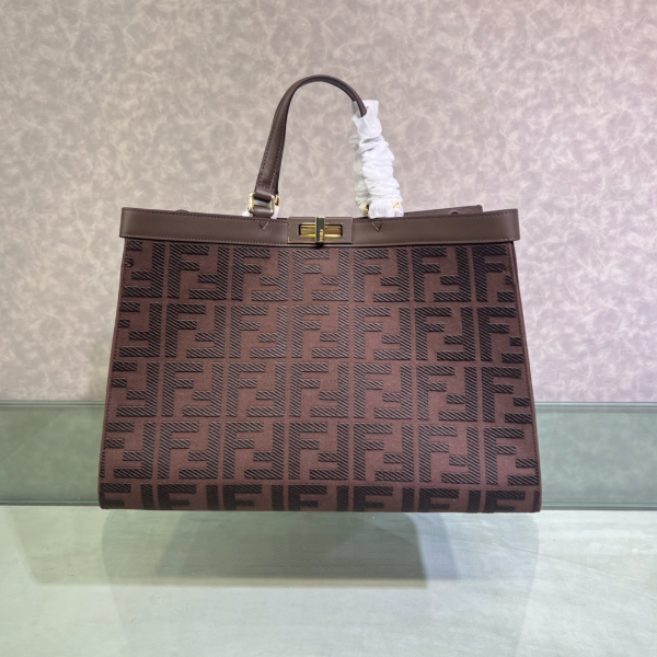 Peekaboo X-Tote medium handbag, made of brown canvas, decorated with FF embossed pattern in the same color. Trimmed with tonal leather and finished with classic twist lock. The unlined interior features a snap-fastening pocket and gold-tone hardware. Comes with two short handles for holding and two long handles for carrying on the shoulder.