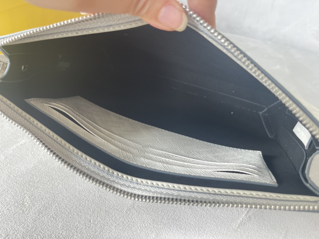 Clutch bag in textured fabric, decorated with white FF pattern and gray FENDI ROMA print. Decorated with white leather details. Features interior compartment with zip closure, card holder and silver-finish hardware. Detachable web bracelet handle with Fendi signature.