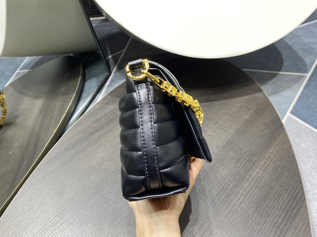Givenchy 4G Soft handbag small. The front of the bag is a metal magnetic buckle with the brand’s 4G logo and a flip closure. There is a flat patch pocket on the back of the bag, and there is also a flat patch pocket on the inside of the bag. The G-shaped chain can be carried on one shoulder or by hand, and the detachable and non-adjustable leather shoulder strap provides a cross-body carrying method.