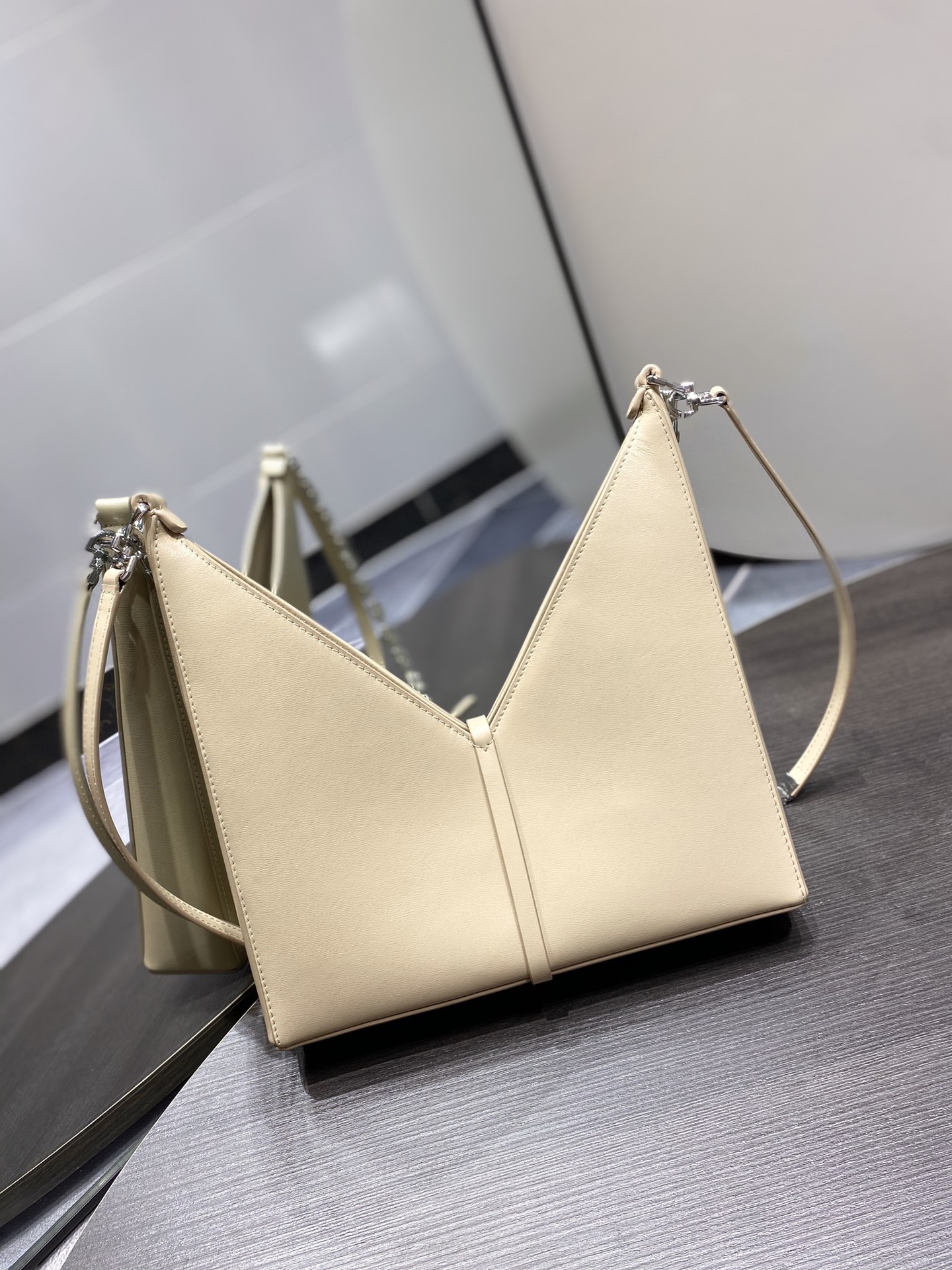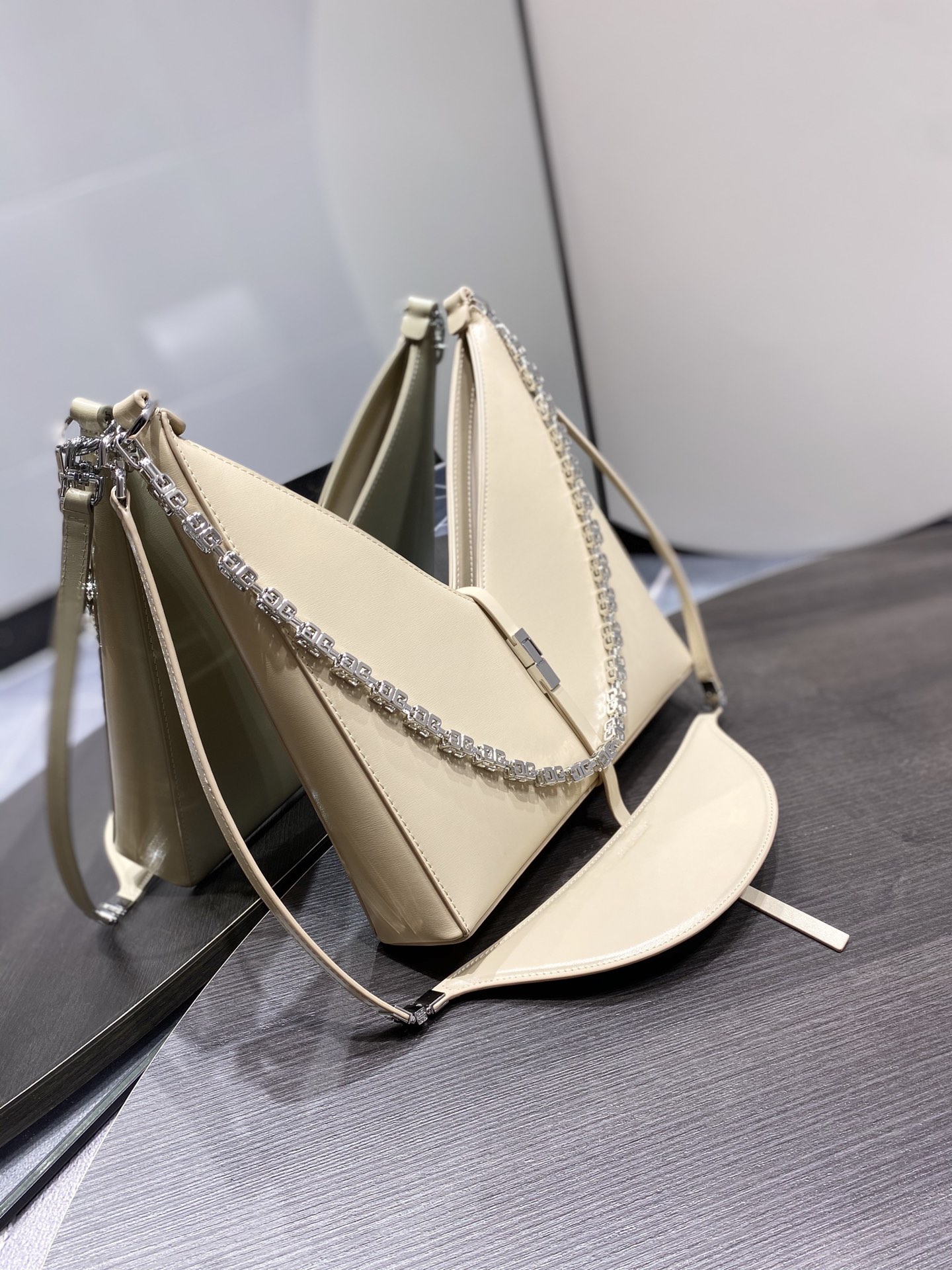 GIVENCHY CUT-OUT chain handbag small is made of cowhide and has a simple triangular cut, which adds a sense of layering and highlights to an ordinary outfit. It perfectly interprets the unisex style. The design of the chain is very special. There is a large shoulder pad on the shoulder strap when worn diagonally, which reduces wear and does not tighten the shoulders. It is really a simple design and full of details. It can be carried by both men and women.