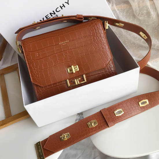 GIVENCHY EDEN BAG medium crocodile pattern. The design is inspired by the story of Adam and Eve in the Garden of Eden, hence the name “EDEN BAG”. Made of cowhide crocodile, it has a flip-top twist-lock closure design, golden metal Double G ornaments, adjustable and interchangeable shoulder straps hanging on the side, and a metal ring on the shoulder strap for hanging charms. 🎁With packaging