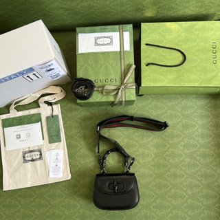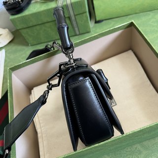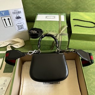 Original leather bamboo mini handbag Gucci’s “Aria-Fashion Aria” series uses modern techniques to reinterpret classic elements. Bamboo is one of the classic elements of Gucci, which has appeared in various series of the brand since the 1940s. After more than eighty years of evolution, this classic element has been reinvented in black leather on this small tote. The handbag is also equipped with two interchangeable shoulder straps – the smooth leather material shows elegant and classic temperament, and the striped webbing shoulder strap shows a strong brand connotation. Sheepskin lining.