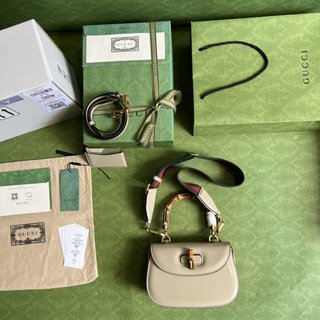 Gucci Bamboo 1947 series bamboo small handbags, the Gucci world uses modern techniques to reinterpret classic elements. Bamboo is a signature element of the brand and has appeared in various collections since the 1940s. After more than 80 years of development and evolution, bamboo has become one of the dazzling design details on this leather mini bag. Crafted from oatmeal leather, this bag has a vibrant feel. Bamboo hardware in oatmeal leather with antique gold tone, interior: card pocket, handle height: 8 cm, detachable shoulder strap (55 cm height).