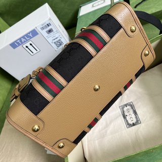Large canvas handbag, the brand new “Exquisite Gucci” series handbags renew the style of travel bags. Brown original GG canvas, striped webbing, double G accessories, and the brand’s classic logo jointly interpret the unique style. Black Classic GG canvas, brown leather trim, gold-toned hardware, red and green Web double G, detachable ID plaque, detachable leather keychain, metal protective feet, side zip closure, interior: 2 zipped pockets, carry handle Hand (8 cm high) detachable shoulder strap (56 cm high) zip closure.