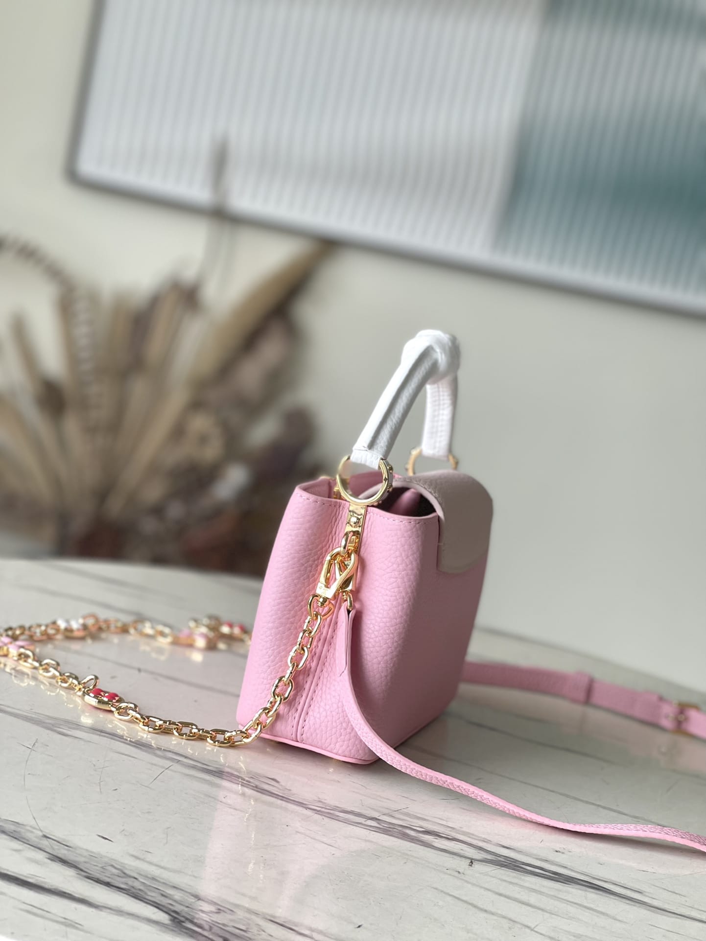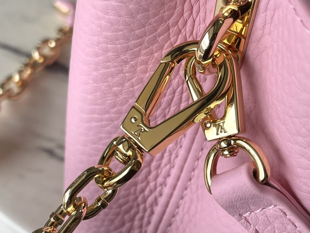 This Capucines handbag is made of Taurillon leather, which faintly reflects the shades of the same color, which makes the classic shape more eye-catching. Matched with the enamel Monogram floral chain, it can be carried by hand, on the elbow or on the shoulder strap.