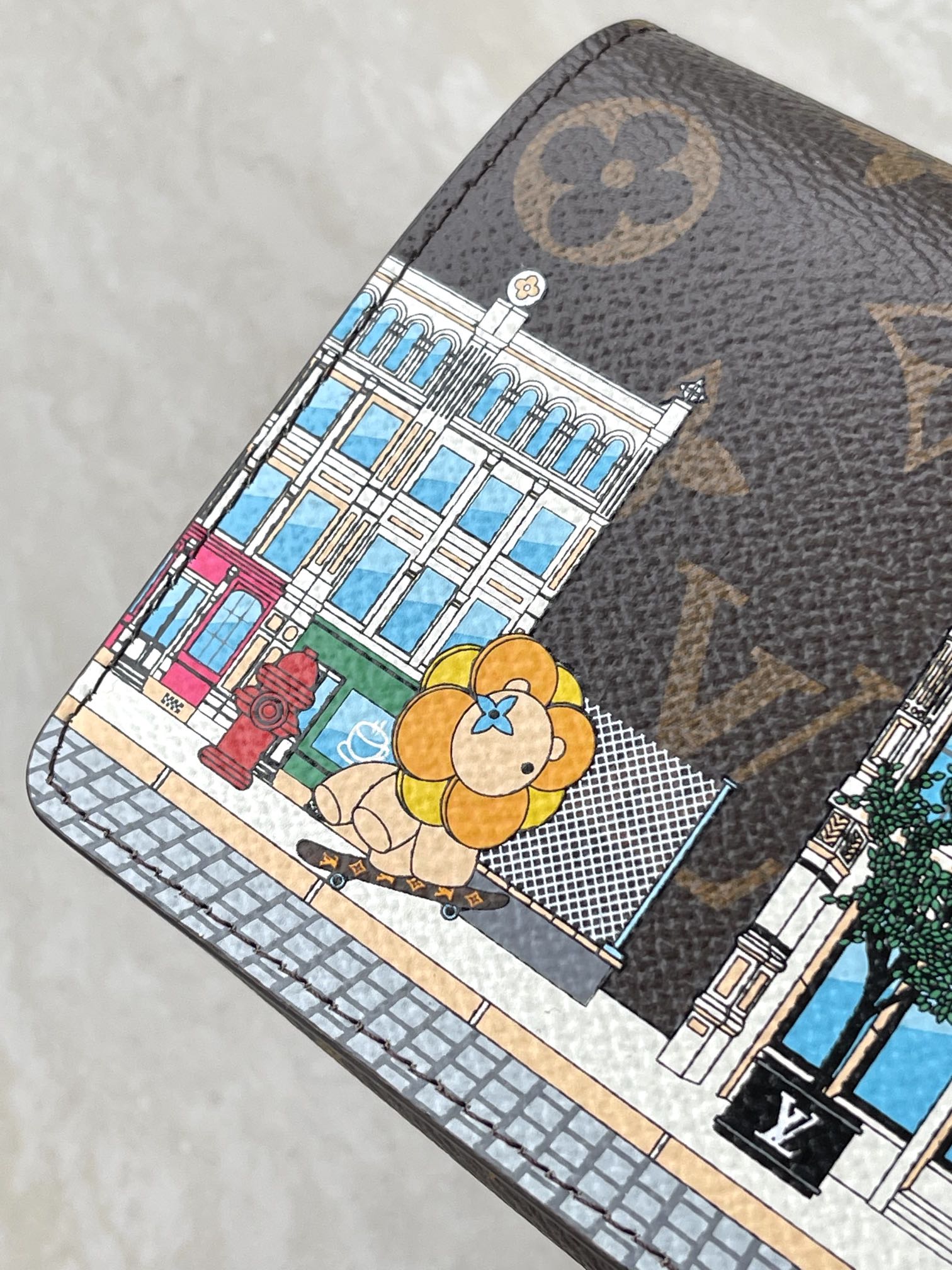 This Sarah wallet is made of Damier Ebene canvas and reinterpreted in the Vivienne Holidays 2022 series, highlighting the spirit of travel. The limited-edition print on the wallet pays homage to Paris with a colorful scene as Vivienne, the Louis Vuitton mascot, cycles past the store in Place Vendome. This elegant collector’s edition flap wallet is lined in pink leather, making it the perfect gift.