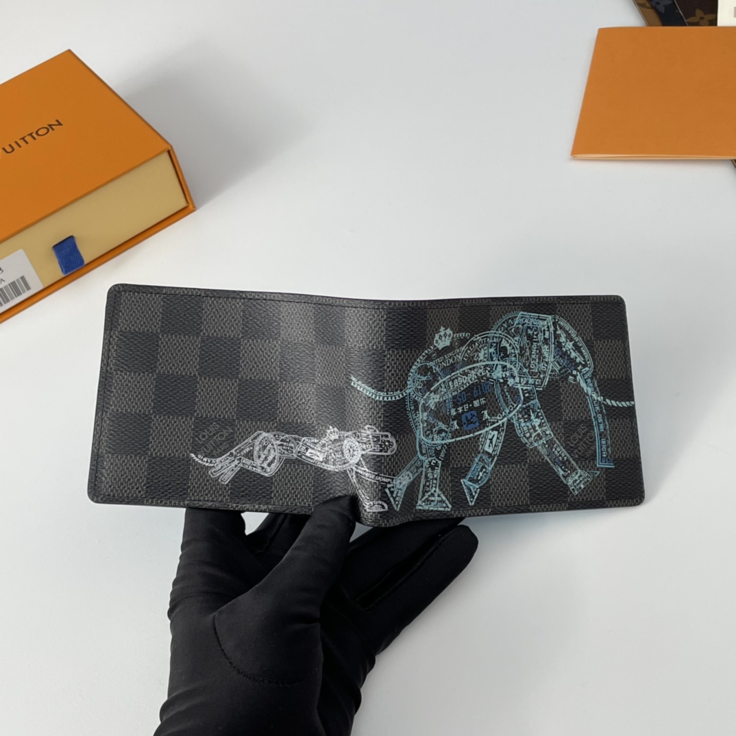 This Slender wallet showcases the exotic style of the Louis Vuitton stamp theme. The image of a running elephant is composed of Damier Graphite canvas against the passport stamp pattern, continuing Louis Vuitton’s travel heritage and is an ideal gift for travel lovers.