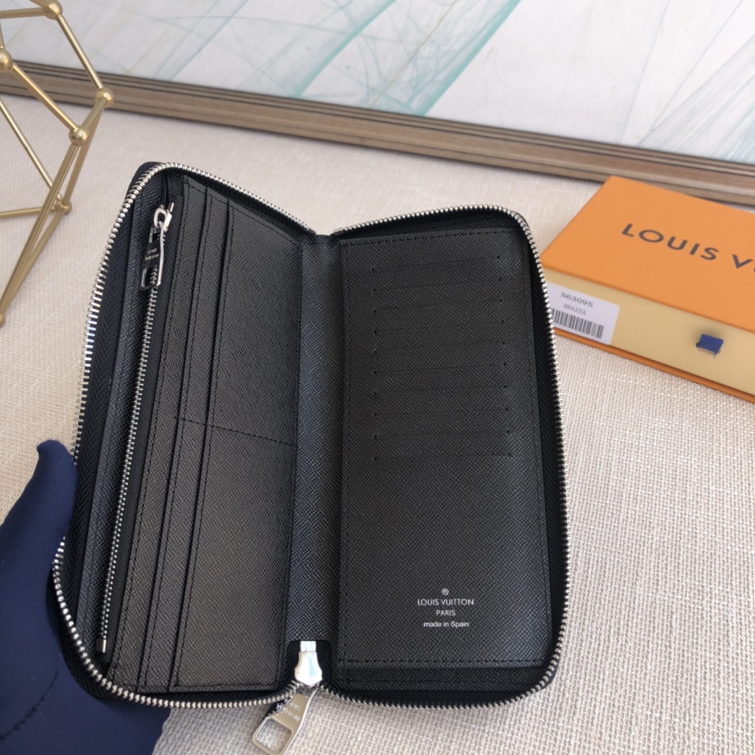 Exclusive real shot! Elegant men’s vertical zip wallet in durable Damier Graphite canvas. Multiple practical pockets and compartments easily hold cash, credit cards and change.