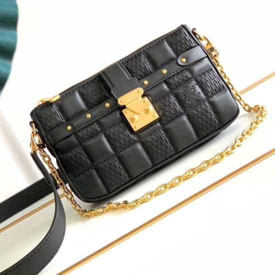 Pochette Troca handbag follows the square shape of Louis Vuitton’s classic Trocadéro camera bag, and is equipped with traditional hard box elements such as the iconic S-Lock lock. The soft quilted sheepskin is embroidered with the Damier pattern and can be worn with a chain or adjustable shoulder strap.